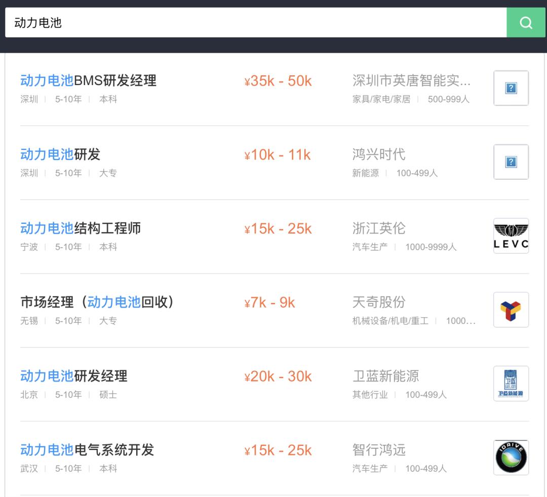 同时,动力电池企业也会直接在招聘软件上进行招聘,车东西在部分招聘软件上也找到了多个动力电池相关的岗位。