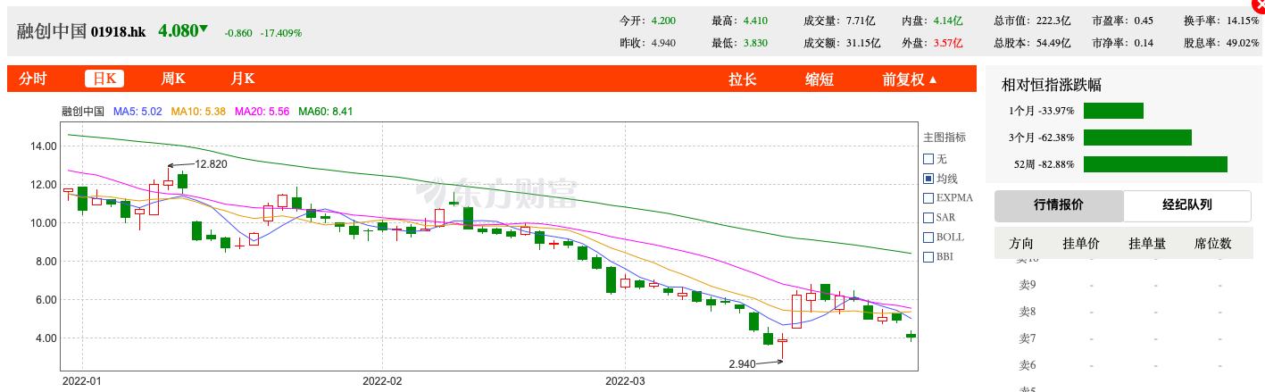 融创中国三连涨后,股价仍不及一个月前 数据来源:东方财富