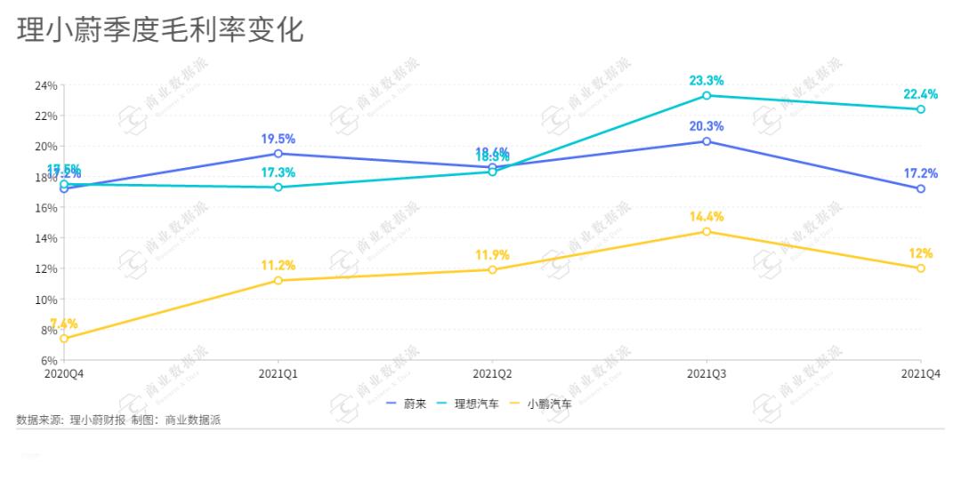 数据显示,2021年蔚来的毛利率为18.9%,汽车毛利率为20.1%;理想汽车毛利率为21.3%,汽车毛利率为20.6%;小鹏汽车毛利率为12.0%,汽车利润率为10.9%。当然,小鹏汽车整车毛利率较低也是有原因的,小鹏几款车型的客单价均在20万元区间,相比之下,蔚来和理想核心车型的单价都在30万元以上。