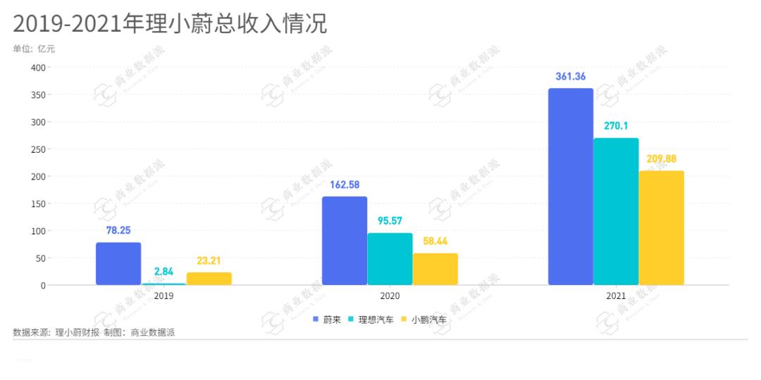 财报显示,2021年,蔚来总收入为361.36亿元,同比增122.3%;理想汽车总收入为270.10亿元,同比增185.6%;小鹏汽车总收入为209.88亿元,同比增259.1%。小鹏汽车因销量的增长,收入增速最大。虽然目前从销量来看,蔚来仍保持较大的领先优势,但理想和小鹏的增速都十分迅猛。