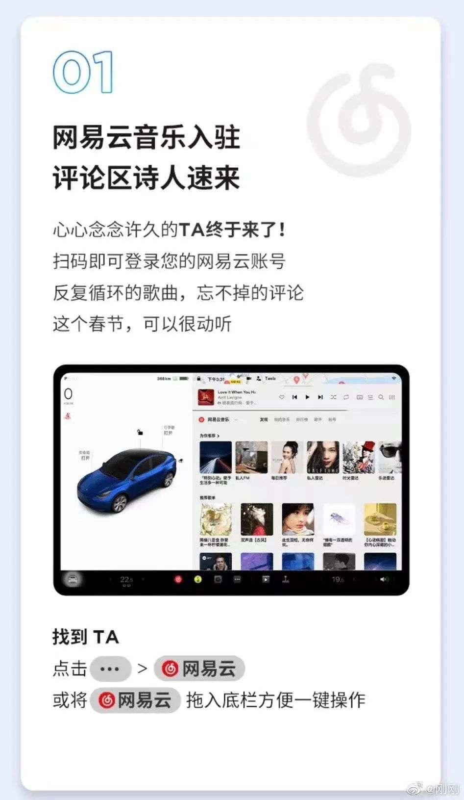 2022年1月28日,网易云音乐与特斯拉共同携手打造了车载版AI“雷达”系列歌单,专门定制了特斯拉品牌歌单《特别心动》。此前,网易云音乐与上线一汽大众、上汽通用、比亚迪、五菱等车企均有合作,带来全新的“汽车+音乐”的用户体验。