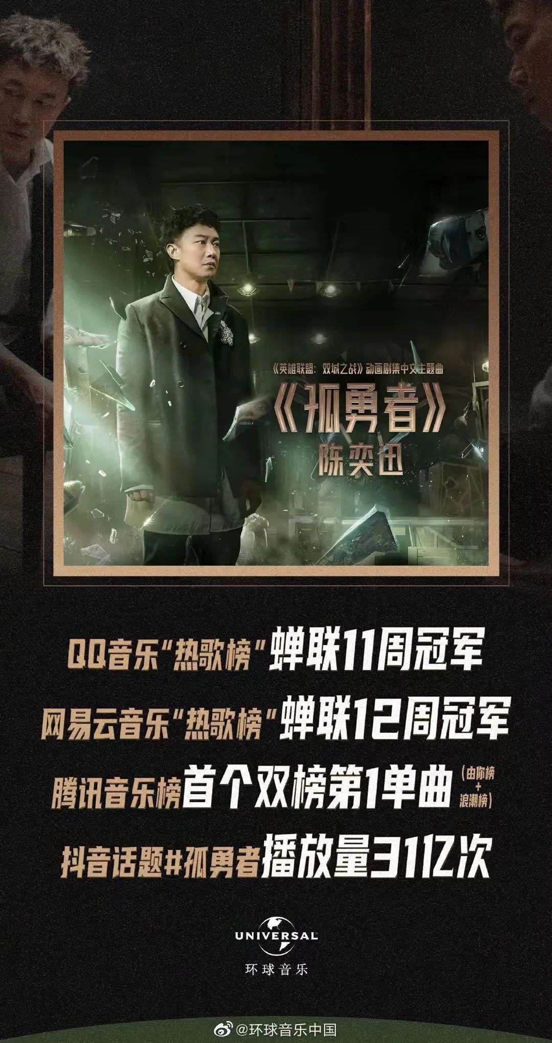 作为《英雄联盟:双城之战》动画剧集中文主题曲,TME在财报中称,《孤勇者》是利用腾讯生态系统的互联,与腾讯游戏联合推广出的一大热门单曲。分别在QQ音乐和网易云音乐的热歌榜创下连续11周和12周的冠军记录,并且是腾讯音乐官方由你榜和浪潮榜的双料冠军。