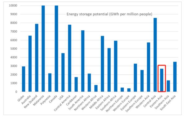 图6:东亚地区拥有每百万人2400GWh的潜在储能容量,资料来源:澳大利亚国立大学研究团队