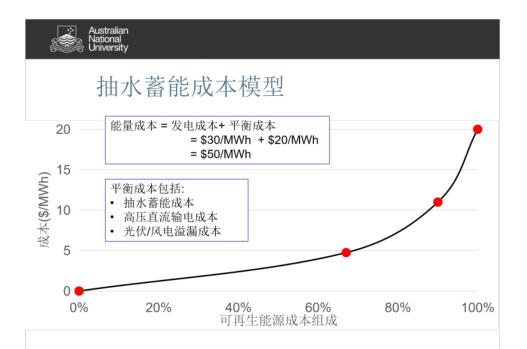 根据澳洲国立大学研究团队的成本模型数据:使用100%可再生能源电力系统发电成本约$30/MWh,平衡成本约$20/MWh (含抽水蓄能、高压直流输电和光伏/风电溢漏成本) ,总度电成本约为$50/MWh (约合人民币0.32元/KWh) 。