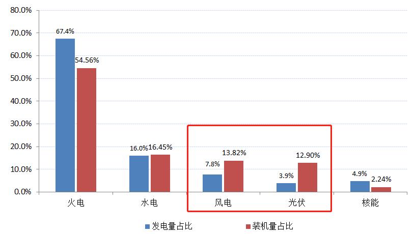 究其原因,光伏和风电这类可再生能源是典型的间歇性能源。什么意思?以风电作为例子,一般在凌晨是风力发电的高峰,但却是用户用电的低峰,发那么多电,用不完;等到早上用电高峰来了,结果风停了,用户又用不上风电。这也是为什么风电、光伏的发电量与装机量占比存在较大差异。
