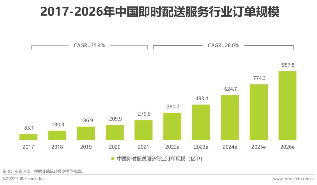 艾瑞测算,2021年即时配送服务行业订单规模为279.0亿单,受疫情恢复影响,即时配送服务市场回暖,同比增速为32.9%。未来随着即时配送服务行业向全场景、全距离、全时段方向发展,并加速成为本地消费的基础服务设施,艾瑞预计2026年,即时配送服务行业订单规模将接近千亿量级,达到957.8亿单,2021年-2026年年复合增速为28.0%,行业整体仍处于快速发展路线上。