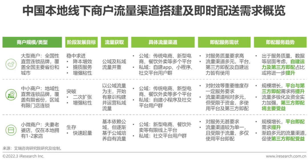 本地线下商户阶段性发展目标的不同,使其对于流量的需求、流量渠道的侧重以及服务质量的要求存在不同的考虑,进而影响其在当前及未来对即配服务商的选择。当商户处于经营初期,快速起量得以生存为其首要目标,这使得具有强势导流能力的线上平台成为其第一选择,但同时受制于流量来源,配送履约多直接由平台完成。随着经营规模的不断扩大,商户阶段发展目标逐渐由生存问题转向如何实现瓶颈突破与稳步进取,降本增效、增强客户粘性等要求的重要性因此提升。日趋成熟的公私域流量运营、多元化的流量渠道以及高质量的即配服务等需求,使得商户使用第三方即配的比例不断攀升,小部分具有强劲资金实力的大型商户或将在战略发展地区自建运力。