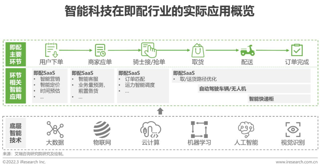 伴随着大数据、物联网等技术的发展,先进智能科技已深入渗透至即配服务流程的各个环节。具体而言,在用户下单到订单完成的整个即配服务链条上,智能化应用在商家经营及即配服务商能力构建方面发挥着越来越重要的作用。以商家自行履约为例,即配SaaS除了覆盖核心运力调度、配置模块外,已发展至即配流程的各个环节,助力商家在一套系统内实现从前端获客到即时配送的高效履约再到售后服务与客户运营。同时配合包括自动驾驶车辆、无人机、智能快递柜在内的智能设备的广泛应用,最终实现链路整体效率的优化,服务质量的提升与客户粘性的增强。