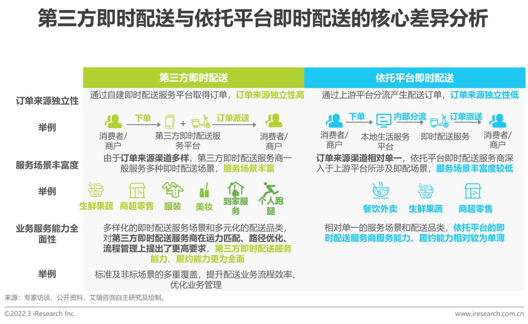 即时配送业务模式分为第三方即时配送和依托平台即时配送,二者的核心区别是订单来源的独立性。与依托平台即时配送业务模式相比,第三方即时配送的订单来源更为独立,订单来源渠道更为多元,业务内容和服务类型更为多样,这也使得第三方即时配送的服务能力相较而言更为系统全面。而依托平台即时配送的业务模式订单来源渠道单一,与上游的平台捆绑较为紧密,业务拓展受限,多样化业务服务能力相对较弱。