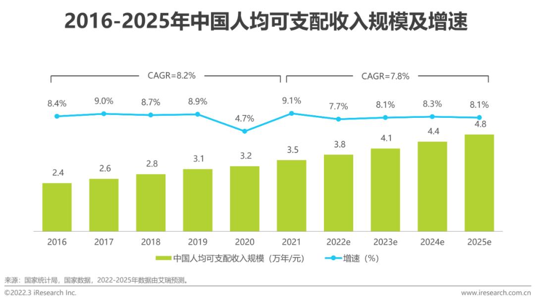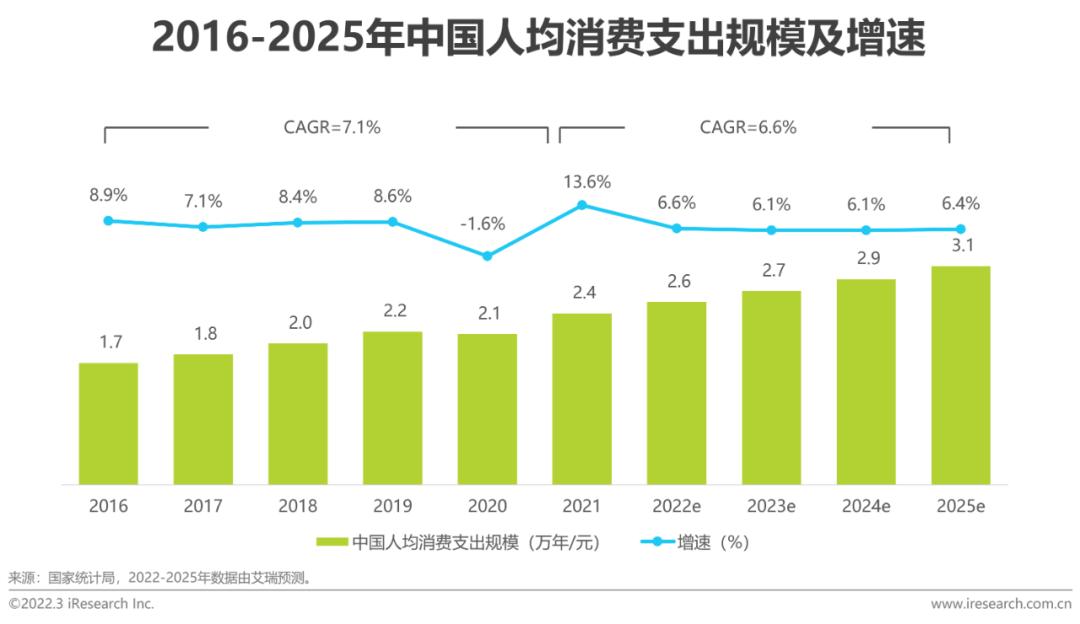 2020年,中国居民人均可支配收入为32,189元,增速4.7%,同GDP增速,受新冠肺炎疫情影响,相较前几年显著降低。同年受可支配收入影响,中国居民人均消费支出为21,210元,增速为-1.6%。但随着国内疫情的动态清零,2021年我国人均可支配收入和人均消费支出已基本恢复疫情前水平,分别约为3.5万元/年和2.3万元/年,预计在未来会进一步提升。可支配收入提升带动消费能力和消费意愿的不断增强,推动消费升级,具体表现为居民开始对所消费产品及服务提出包含品质化、多元化、个性化、便捷化等维度在内的更高要求。