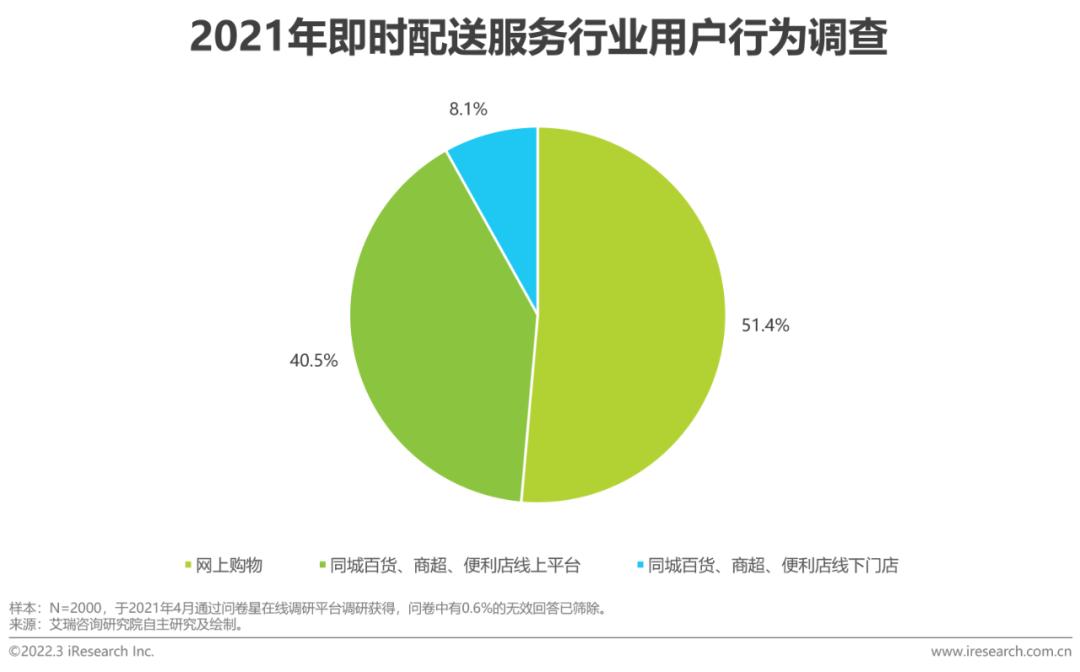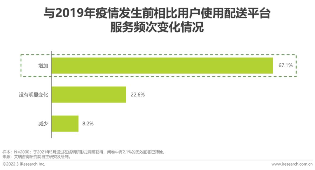 新冠疫情期间,大量线下业态陷入停摆状态,促使各行各业的商户积极拥抱线上化。同时,由于全国多地小区的封闭化管理措施,居民即时消费行为逐渐由线下切换为线上。在供需双方的共同推动下,同城即时消费在疫情期间迎来爆发。即使进入疫情常态化防控阶段,线下活动日渐恢复,供给端的结构性变化与需求端习惯的养成使得线上下单、线下送达模式已然成为新常态。根据艾瑞用户调研结果显示,为解决日常所需,超90%的用户更倾向于在线上消费。并且,值得注意的是,受益于此,即时配送行业发展被按下“加速键”。根据艾瑞用户调研结果,与2019年疫情发生前相比,67.1%的用户认为使用配送平台服务频次增加,即配需求增势明显。
