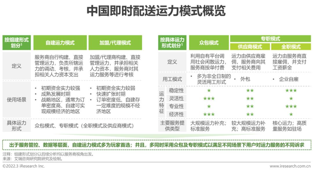 即时配送运力模式:按组建形式可分为自建运力模式、加盟/代理模式;按运力形式可分为众包模式、专职模式