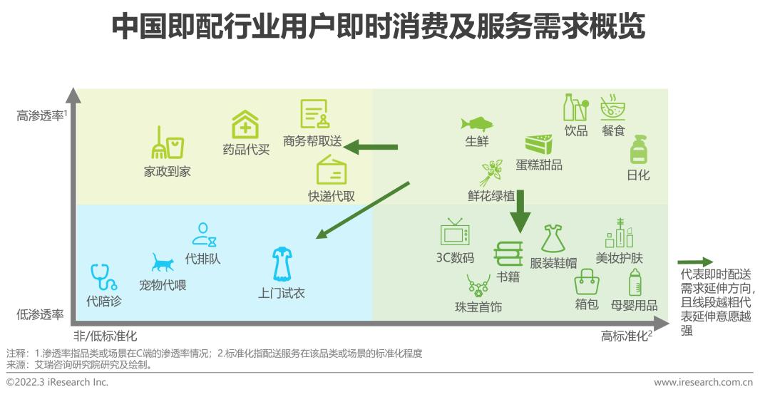 根据即配行业所涉品类及服务的标准化程度以及这些品类、服务在C端的渗透程度可将用户需求大致划分成四类。其中,得益于餐饮外卖平台的长期教育与疫情催化下即时零售平台的高速发展,餐饮、甜品、生鲜及日化等品类的渗透率已较高,并逐渐向3C数码、美妆护肤等延伸。同时,值得注意的是,随着线上即时消费理念的不断渗透、相关线上平台玩家服务范围与能力的提升以及智能科技的进一步应用,除了对商务函件专送、药品代买等发展较成熟的非标准即配服务需求提升外,用户对于上门试衣、代排队、代陪诊等长尾服务的需求也呈增长态势。而这些日益增长的个性化、多样化、非标化的即配服务需求,也正促使着即配服务商对应布局,提升增值服务能力,进一步扩大即配服务范围。