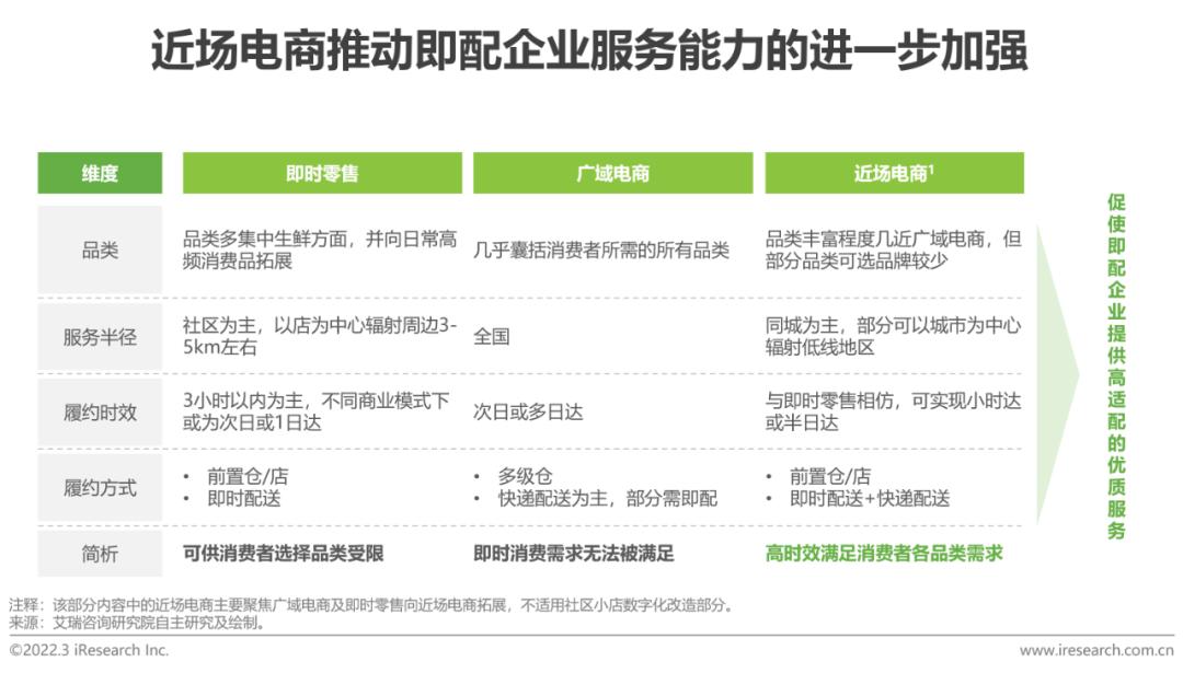 消费者长期存在的全品类一站式消费需求与即时收货之间的矛盾推动零售行业商业场景的不断创新与优化。从线下商超百货至线上综合电商,消费者近场电商需求日渐显现。根据艾瑞用户调研结果,约78%的受访者在网购时更加倾向于同城商家发货。该消费者趋势以及近场电商在品类与时效上的更优平衡,驱动即时零售及广域电商两大平台加速对近场电商场景的开拓,而新场景下品类的扩展或将改变配送的工具、并单的逻辑、配送考核的指标等,这要求即配服务商提升综合能力,进而为各品类客户提供适配、优质的配送服务。