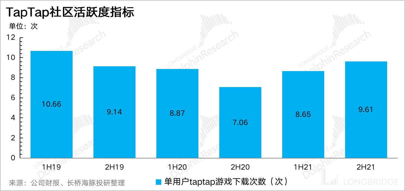 (2)下半年大厂有几款热度较高的游戏测试和发布,TapTap 作为游戏社交性平台,除了提供预约、下载以及测试外,玩家在平台上的交互也会迎来高热度。以人均下载次数为例,下半年人均下载 9.6 次,同比明显提升。