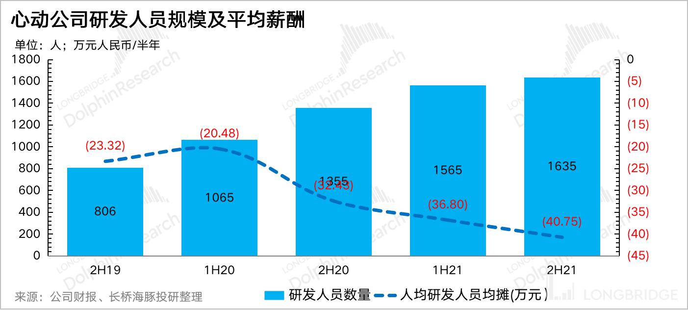 在费用端,心动的研发费用占了一半以上,研发费率也是从 2020 年下半年开始一路走高至 50%,显著高出行业水平(参照网易 16%),海豚君认为,其中主要就是顺应行业内卷对员工大幅涨薪带来。