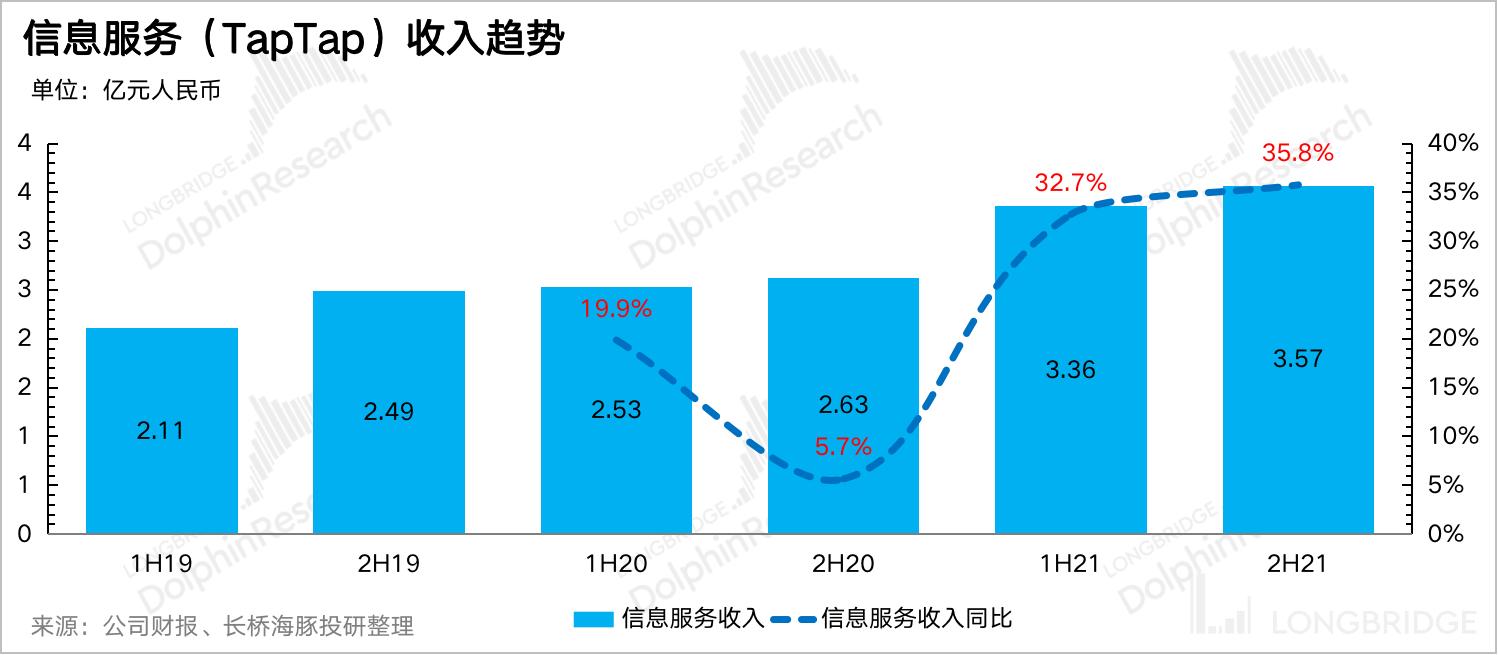尽管国内监管较严,游戏广告受整顿平台报价走低(可以从单用户广告价值来体现),但流量扩张、加载率的提升叠加带动下半年 TapTap 的信息服务收入加速变现,下半年 3.57 亿的游戏买量收入,同比增长 36%。