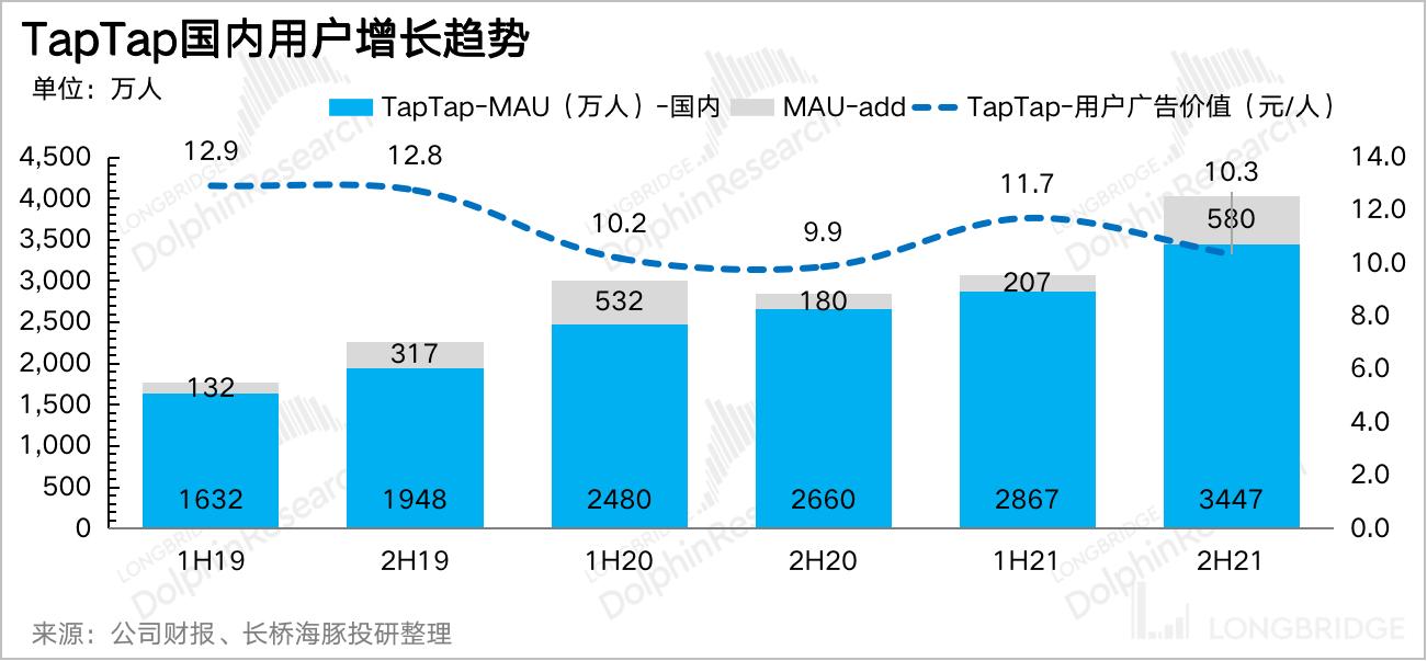 2021 年国内 TapTap 全年 MAU 为 3157 万人,按平均值倒算下来,下半年应该达到了 3400 万,相比上半年增速加快。主要原因,海豚君认为有两方面: