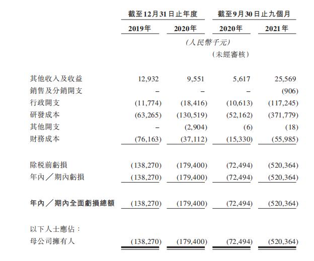 招股书显示,瑞科生物2019年、2020年营收分别为1293万元、955万元;瑞科生物2021年前9个月营收为2557万元,上年同期的营收为562万元、瑞科生物2019年、2020年期内亏损分别为1.38亿元、1.79亿元;瑞科生物2021年前9个月期内亏损为5.2亿元,上年同期的期内亏损为7249万元。