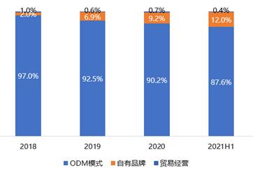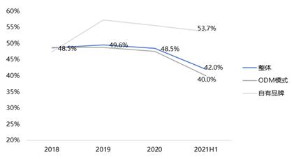 由于自有品牌主要面向C端销售,ODM模式主要面向B端,所以对比自有品牌,ODM模式下买卖双方的合作关系相对稳固,而且不用在营销上投入过多,所以销售费用率亦相对更低。但是,代工方为了稳固长久的合作关系而适当让利,所以ODM模式的毛利水平低于自有品牌。