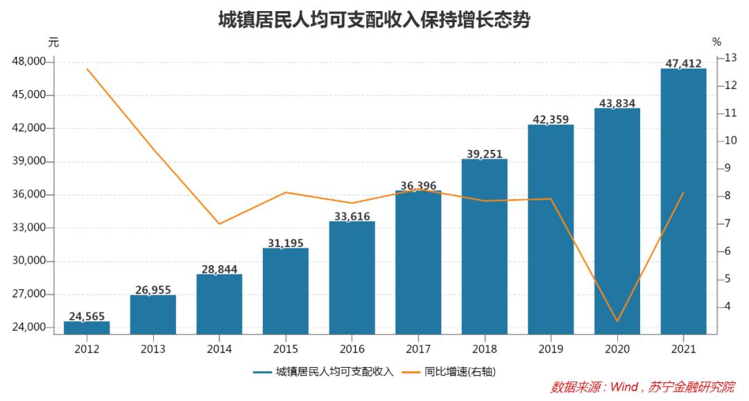 作为可选消费品,白酒涨价的根本驱动力是消费升级,背后是居民可支配收入的稳步增长。近年来,虽受疫情扰动影响,但城镇居民人均可支配收入依旧保持上涨态势,2021年同比涨幅8.16%,基本恢复至疫情前水平。在全年GDP增长5.5%的目标下,2022年居民可支配收入有望维持较高增速水平,为消费升级提供支撑。在这个意义上,高端白酒的基本面不值得忧虑。