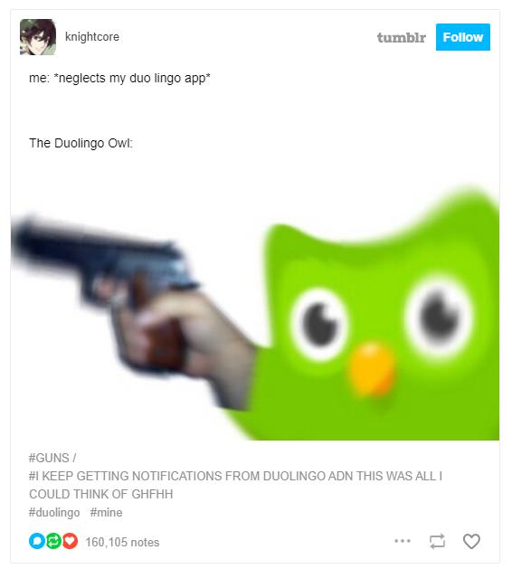 比如Tumblr 用户 knightcore 的这条帖子:因未登录多邻国而处于多儿枪口下。