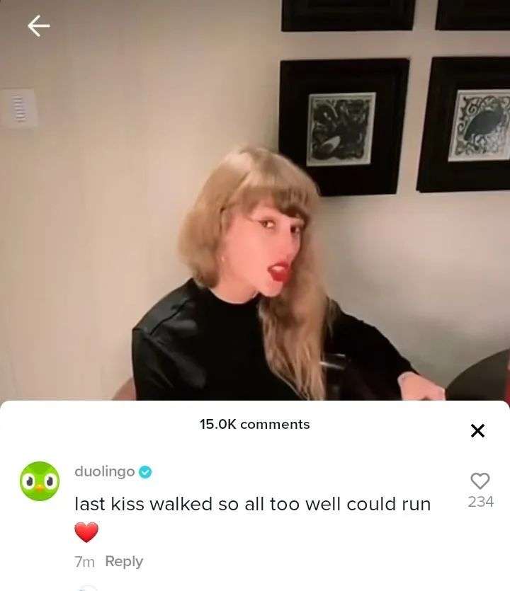 比如 @duolingo 的一个1000 万次以上的观看次数的视频中,就使用了当时的tiktok流行音乐梗:歌手泰勒的歌曲“Enchanted”。该网络梗的大意是:你戏剧性地唱着不希望你的前任爱上别人的歌。