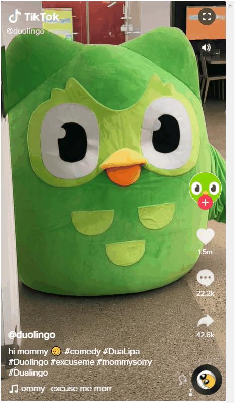 在TikTok 上,语言学习类app多邻国掌握了社交媒体的流量密码——以真人大小的品牌吉祥物——多儿(英文名:Duo)为主角,通过令人发指的、有趣的,甚至不合常理的视频,成功引起了病毒式的传播。