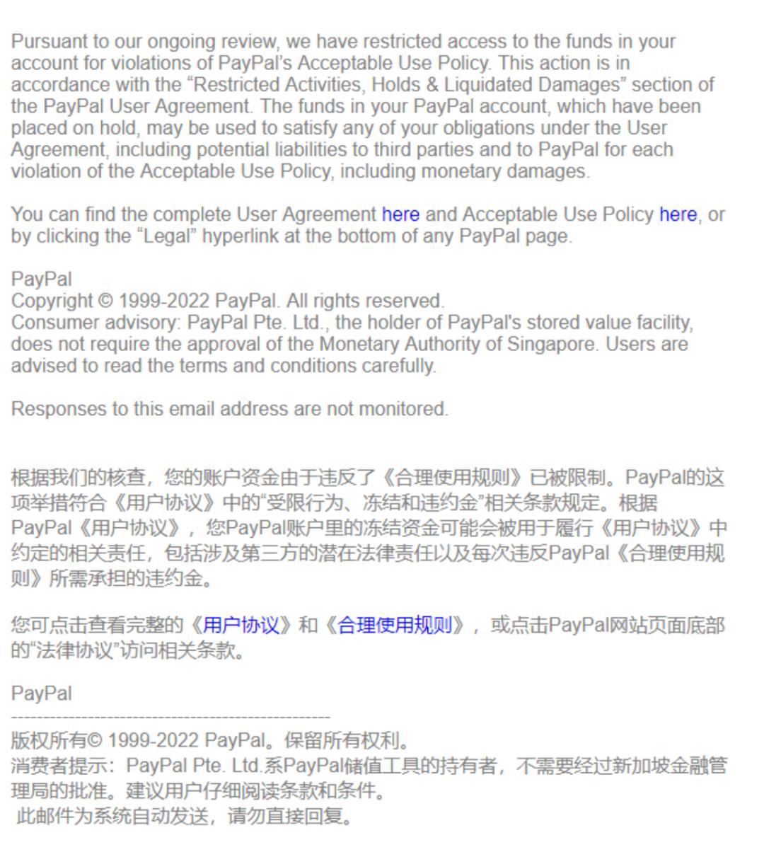 (PayPal用户协议中的《受限行为、冻结和违约金》)