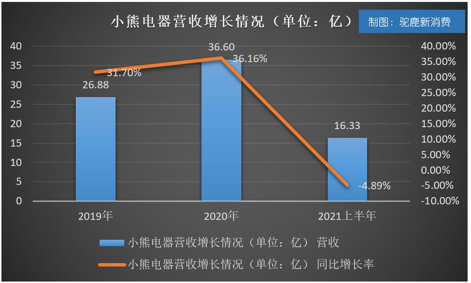 到2021年第三季度,小熊电器的营收增幅进一步下探,下跌6.29%。
