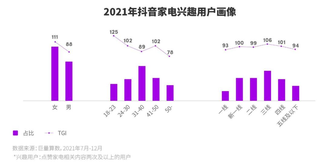 日前,由抖音电商和巨量算数联袂发布的《2022抖音电商家电行业洞察报告》(下简称《报告》),观察到了其中的一些趋势。例如,在家电采购中,“女性是占据了不止半边天的角色。她们不仅对家电内容表现出了更高的偏好,且兴趣用户的占比仍在提升。除了这一特征,年轻消费者(18-23岁)和三线城市用户的偏好也尤其明显。”
