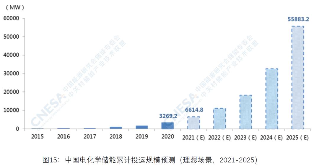 2021年,电化学储能市场继续保持快速发展。在较理想的市场发展前提下,2021年市场累计规模将达6614.8MW,新增3.34GW。在较保守的市场发展前提下,2021年市场累计装机规模为5790.8MW,新增2.52GW。
