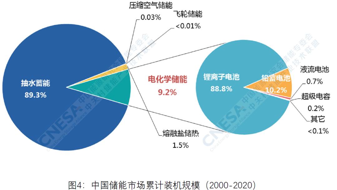 在各类电化学储能技术中,锂离子电池的累计装机规模最大,为2902.4MW,占比88.8%。锂离子电池技术是目前最主要的电化学储能技术。
