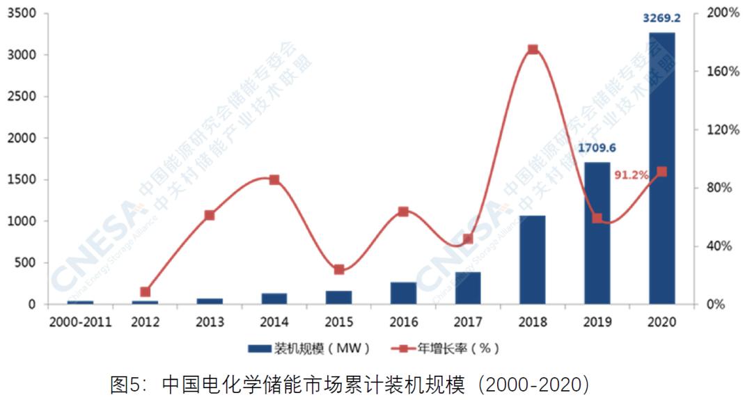 截至2020年底,中国电化学储能的累计装机规模为3269.2MW,较2019年增长1.56GW,同比增长91.2%。