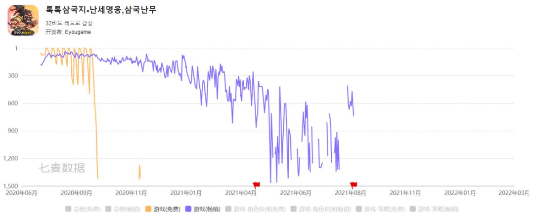 《霸王雄心》还是款出海产品,甚至有段时间算是表现不错。游戏的韩国版本在2020年中旬上线,当时最高排到了韩国iOS畅销榜40名的位置。游戏在上线前2个月内9次进入了免费榜TOP5,从第三个月开始游戏逐渐减少了买量推广,在畅销榜上的排名也迅速掉出TOP100。