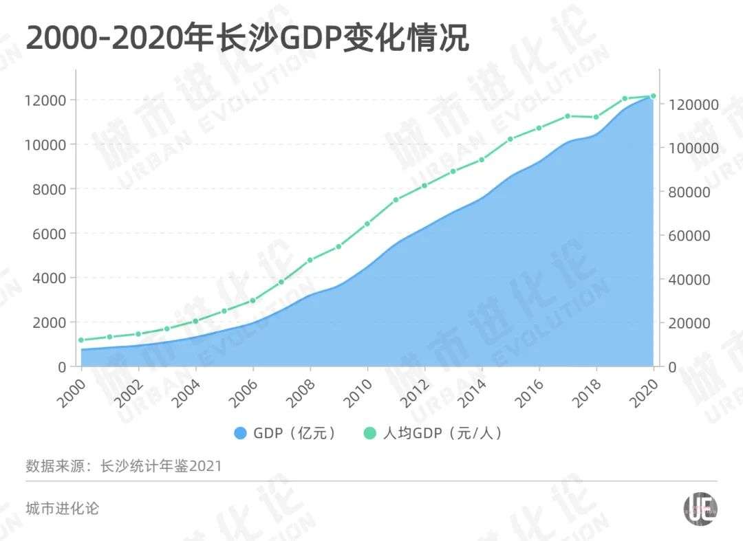 跟郑州类似,长沙也被视为过去20年经济增长最快的城市之一。从2000年至2020年,长沙GDP从720.85亿元上升至12142.52亿元,增长16.84倍。