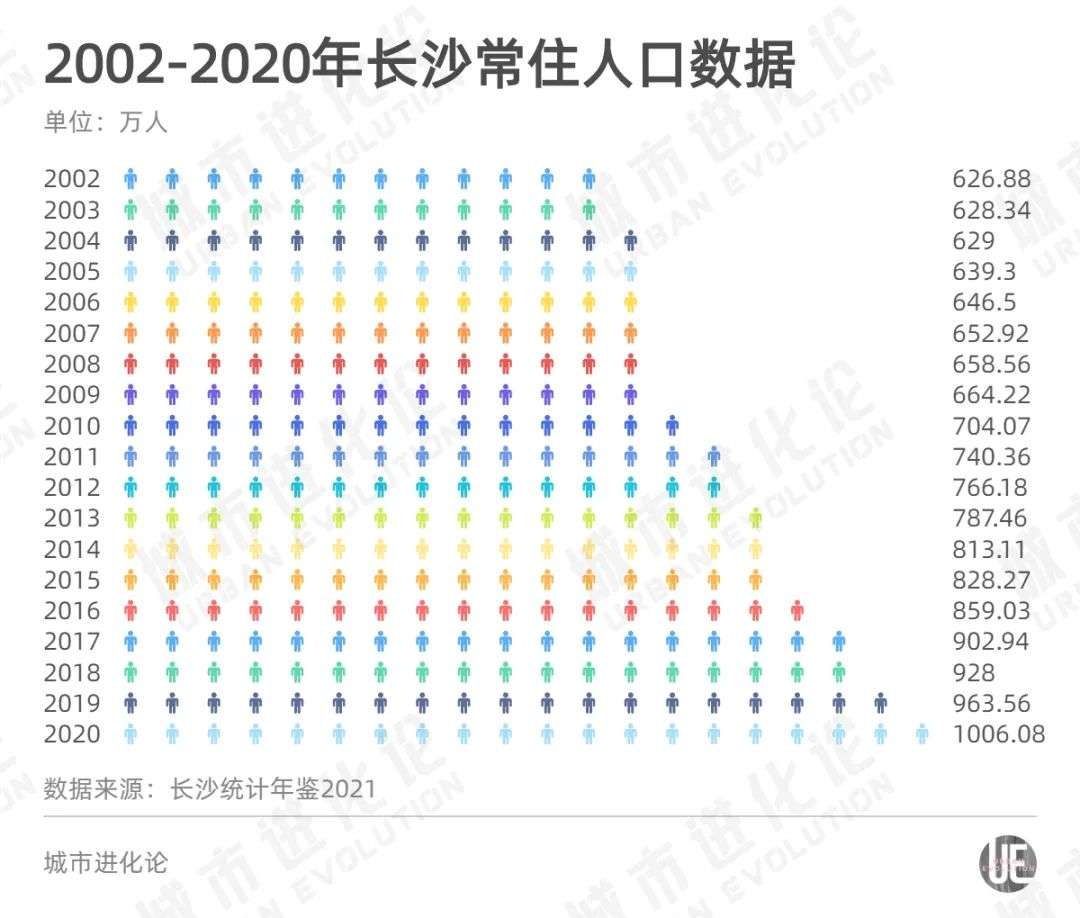 在城区规模和人口规模上体现同样明显。2000年至2020年,长沙市区面积从556.33平方公里增长至2150.9平方公里,常住人口从613.87万人增长至1006.08万人,晋级特大城市行列。