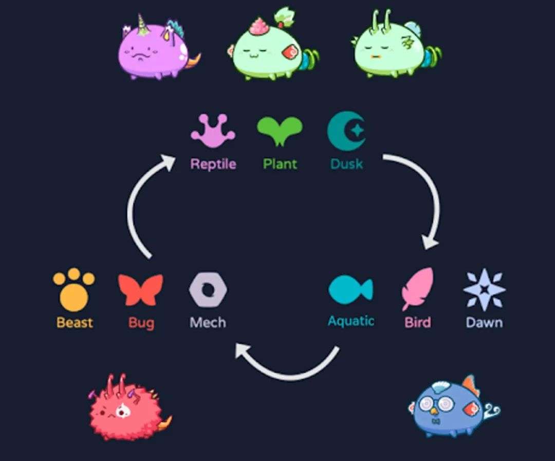 其中,游戏中玩家最核心的资产是NFT形式的Axie小精灵们。跟宠物小精灵的设定类似,这些Axies被划分成了不同的属性,目前包含爬行系、植物系、暗夜系、水系、飞行系、光系、机械系、昆虫系和野兽系这九大种类。