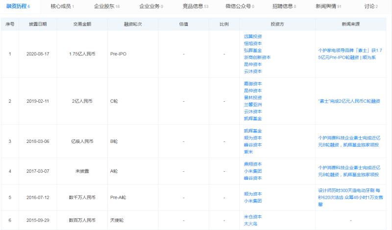 可以说,自2015年以来,素士先后受到多家投资机构或公司的青睐,平均每年都可以拿到一轮融资。截至目前,素士共完成6轮融资,投资方包括小米集团与顺为资本等知名投资机构或企业。2020年8月,素士宣布完成由远翼投资领投的1.75亿元Pre-IPO轮融资。