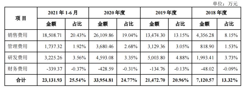 报告期内,素士科技销售费用分别为4356.28万元、1.35亿元、2.61亿元和1.85亿元,销售费用率快速上涨,分别为 8.15%、13.15%、19.04%和20.43%。