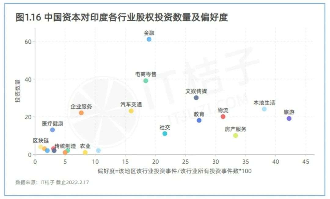 从偏好度来看,中国资本对印度社交、旅游、房产服务、本地生活服务几个领域的偏好度较高。