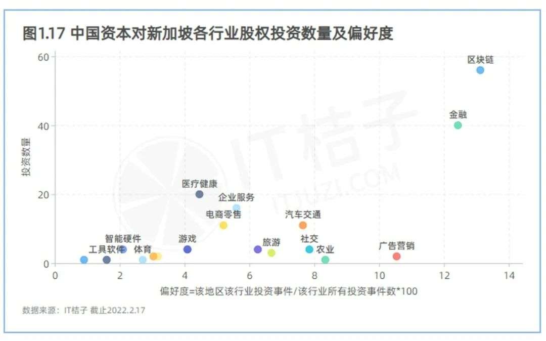 IT 桔子数据显示,在投资数量上,中国资本对新加坡股权投资相对较多的行业是区块链。主要原因是,与中国政府对数字货币监管政策收紧不同,新加坡政府认可、并支持创新业态的发展,政策比较开放。