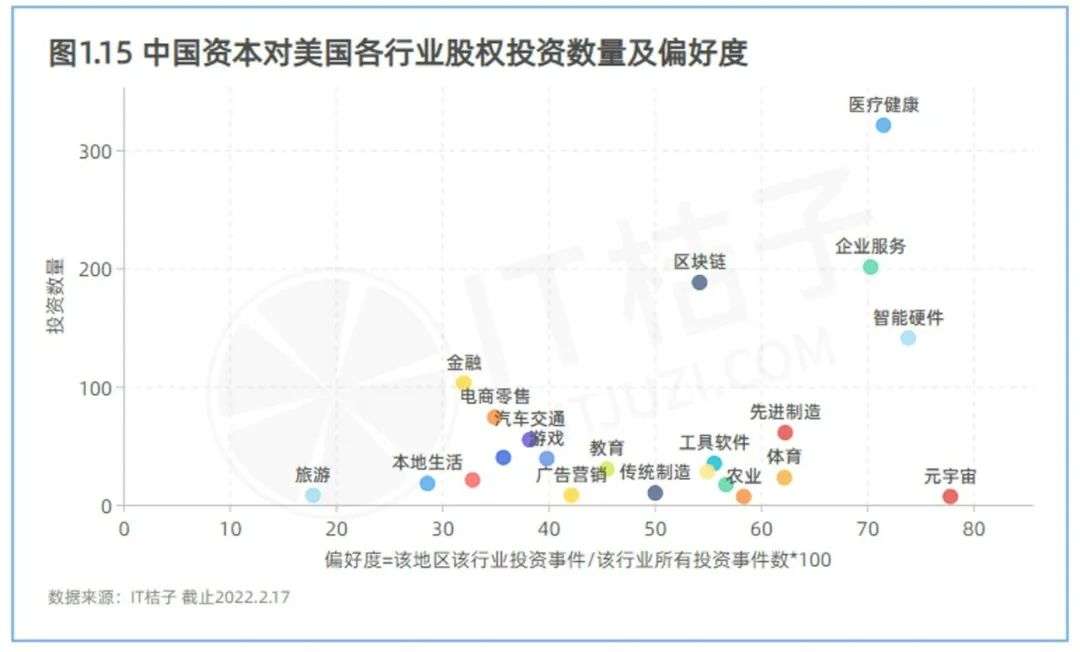 就投资数量而言,中国资本对美国股权投资市场布局频率和密度最高的行业是医疗健康、企业服务、区块链、智能硬件及金融行业,投资次数均超过了 100。投资次数最少的则是传统制造、旅游、广告营销、农业和元宇宙,中国资本对美国这类行业的投资出手少于 10 起。