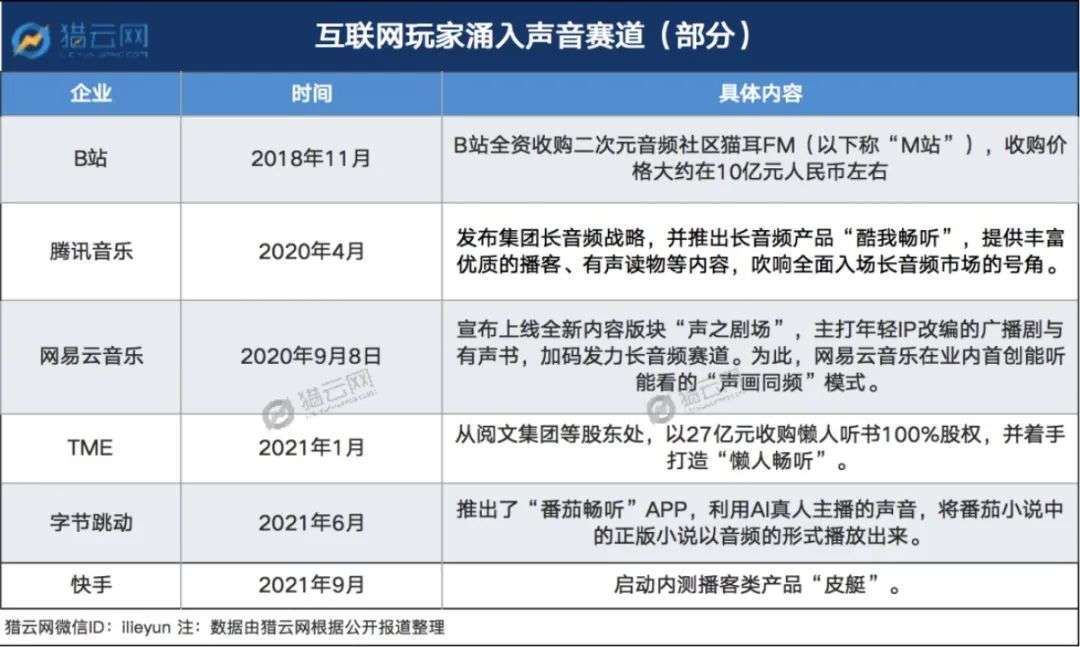 但值得注意的是,近两年外部互联网巨头为寻找新的发展空间,也开始进入音频赛道。据不完全统计,从2020年起,腾讯音乐、网易云音乐、字节跳动、快手、B站等新玩家,通过不同方式涌入在线音频赛道。