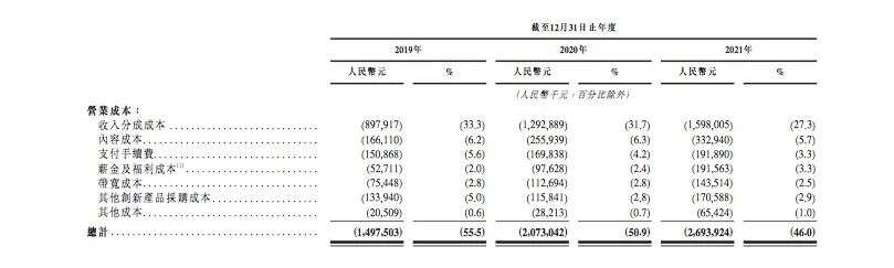 收入分成成本指喜马拉雅根据收入的协定百分比向内容创作者及第三方IP合作方付款,其于2019年、2020年以及2021年占总收入的百分比分别为33.3%、31.7%及27.3%。内容成本主要指许可版权的摊销开支,其于2019年、2020年及2021年占总收入的百分比分别为6.2%、6.3%及5.7%。