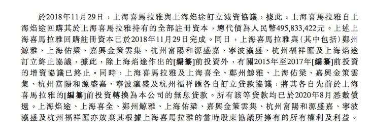此外,在2018年11月29日,喜马拉雅还与上海焰途订立减资协议,据此,喜马拉雅自上海焰途回购其于喜马拉雅持有的全部注册资本,总代价为人民币4.958亿元。同日,喜马拉雅与(其中包括)郑州 鲸雅、上海佑梁、嘉兴金策云集、杭州富阳和源盛嘉、宁波瀛盛、杭州福祥汇及上海焰途订立终止协议,据此,除上海焰途作出的前投资外,有关2015年至2017年前投资的增资协议已终止。