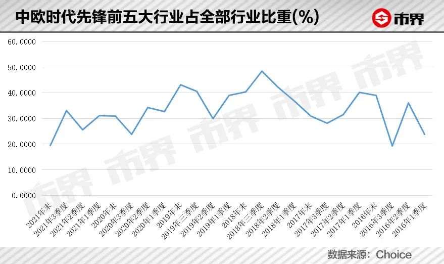 2016年一季度至2017年末,中欧时代先锋有6个季度前十大持仓股变动超过5只。第一大重仓行业从电子到机械设备,再到电力设备,几乎每个季度的重仓行业都会发生变化。