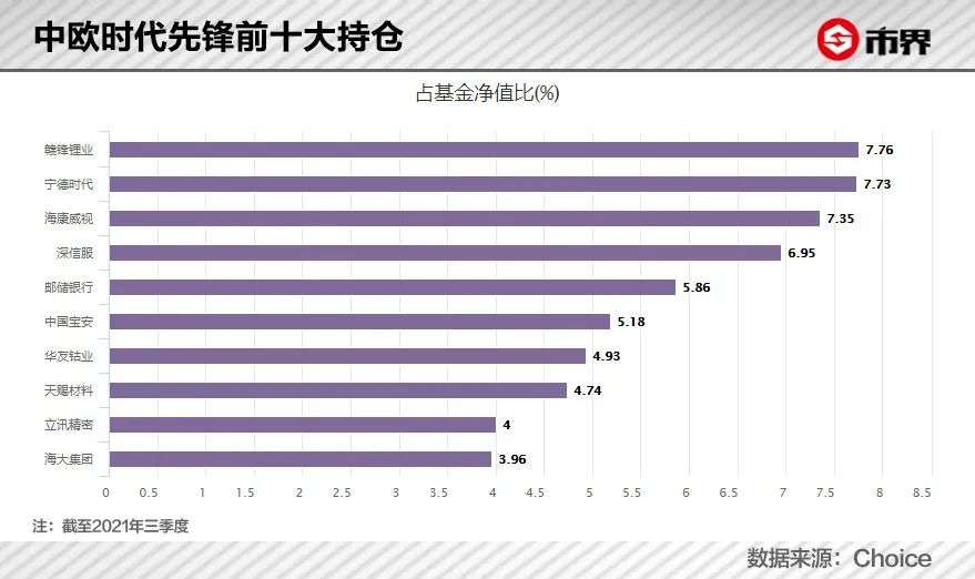 2021年三季度,中欧时代先锋前十大持仓中,既包括新能源等热门行业龙头,也包括邮储银行这种传统公司和云计算厂商深信服等软件厂商。而且,在前十大持仓中,周应波连续持有赣锋锂业、深信服7个季度;宁德时代5个季度,另有邮储银行、海康威视等连续3个季度以上的个股。