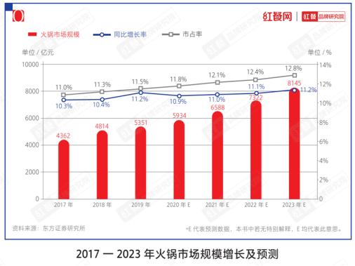 2019年整个火锅产业链的规模约为5351亿元,预计到2023年,我国火锅门店的市场规模将突破8000亿元,约为全国餐饮规模的12.8%。