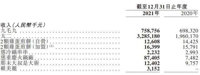 刚刚披露的2021年年报显示,九毛九西北菜、太二酸菜鱼、2颗鸡蛋煎饼、怂冷锅串串、怂重庆火锅厂、那未大叔是大厨、赖美丽青花椒烤鱼七个品牌在去年累计开店133家,其中包括1家九毛九西北菜、122家太二、1家2颗鸡蛋煎饼加盟店、7家怂火锅及2家赖美丽。